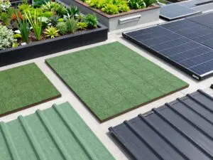 When installing green roofing materials, start with a structural assessment to guarantee your roof can handle the weight. Create an efficient drainage system and check